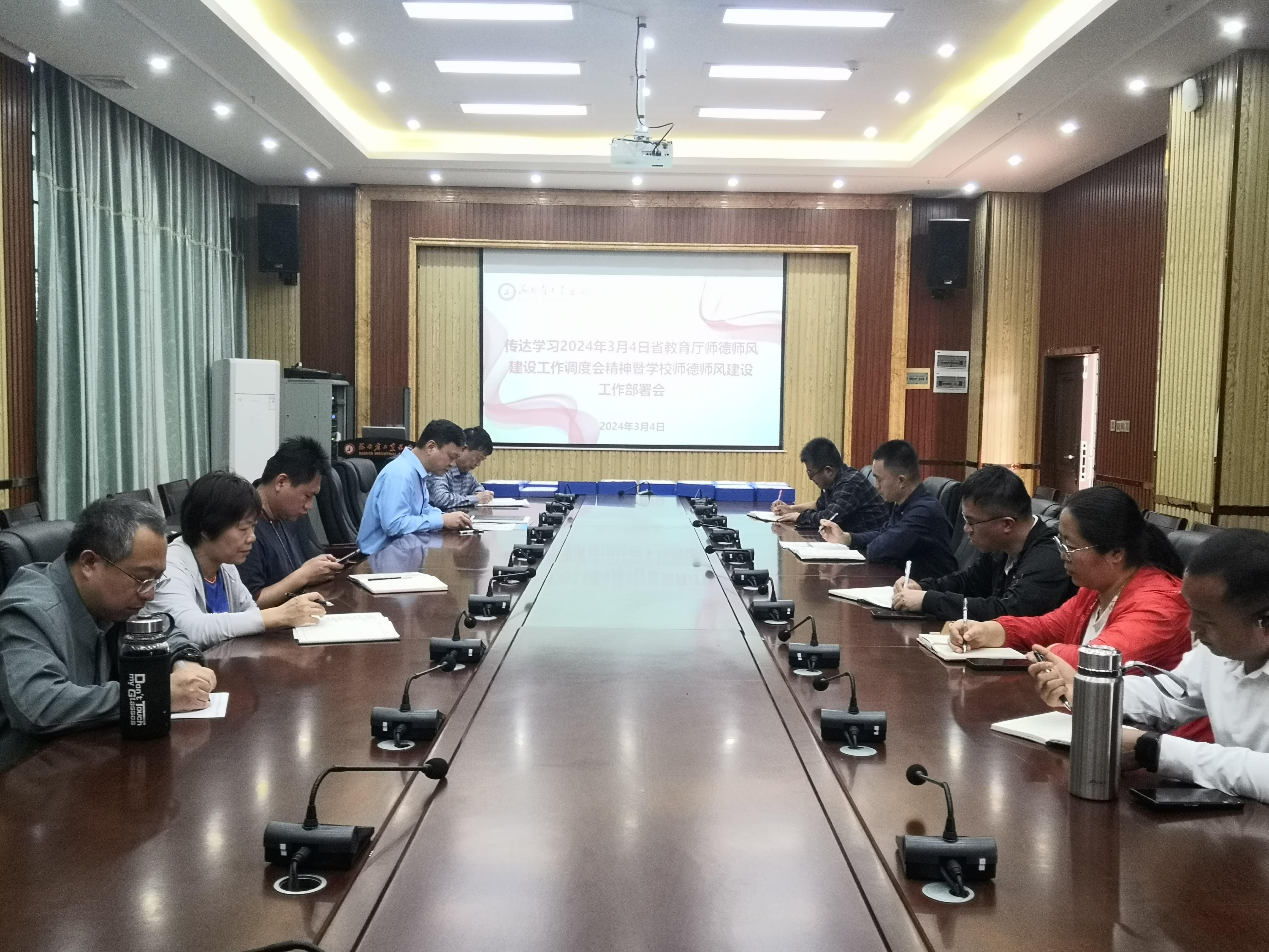 二、2024年3月4日,根据省教育厅的师德师风建设工作调度视频会议精神,爱体育在线注册(中国)官方网站召开传达省教育厅师德师风建设工作调度视频会议的精神暨学校师德师风工作部署会议。