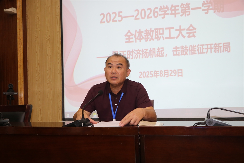 风正时济,扬帆起航;击鼓催征,共启新局。为进一步强化学校管理团队建设,提升中层干部素养,引领全体教职工统一思想、提高站位、精诚团结、实干高效,确保2025年秋季学期安全、平稳、有序开学,8月29日上午,爱体育在线注册(中国)官方网站召开了新学期全体教职工大会,全面部署新学期各项工作,共谋学校发展新篇章。 会议伊始,党委书记罗雅传达学习上级部门有关秋季开学安全工作的文件和工作提醒精神,强调要提高安全意识,强化责任担当,牢固树立安全风险防范意识,坚决克服麻痹大意和侥幸心理,加强安全隐患排查,始终把师生生命财产安全和校园安全放在首位,确保秋季开学有力有序、安全稳定。